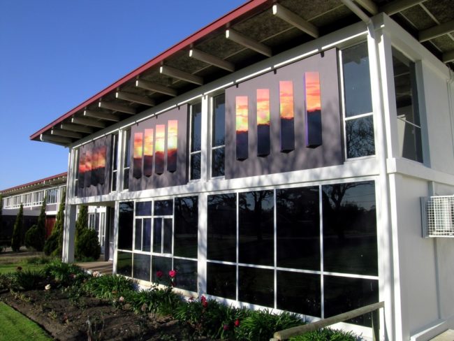 Vitrapanel Custom Image panels Vitrapanel Custom Image panels were designed for the external facade of the school at Ellenbrook, showing a colourful and bold design capturing the lively nature of the school environment. Vitrapanel Custom Image allows the designer to use a unique design for external cladding that is graffiti resistant Lecture Theatre, Ellenbrook Secondary…